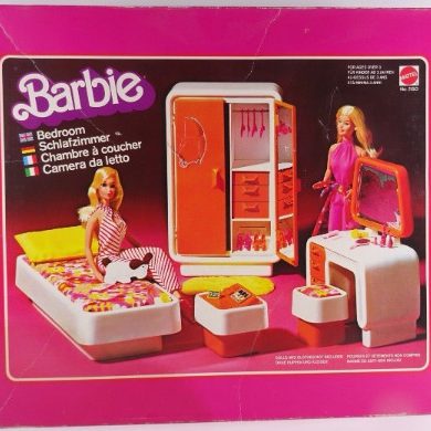 Dieses Barbie Schlafzimmer Möbelset (Mattel Ref. 2150) aus den späten 1970er-Jahren ist ein echtes Highlight für Sammler und Liebhaber von Vintage Barbie Möbeln. Es wurde von Mattel als Teil der beliebten Barbie-Möbelserie produziert und bringt den authentischen Charme der 70er zurück.